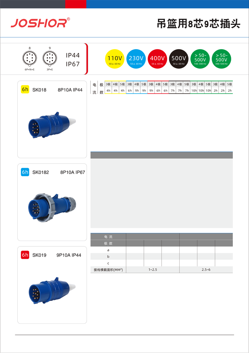 JOSHOR吊篮专用工业航空插头SK019 9芯10A/7P+N+E/IP44/6H/380V
